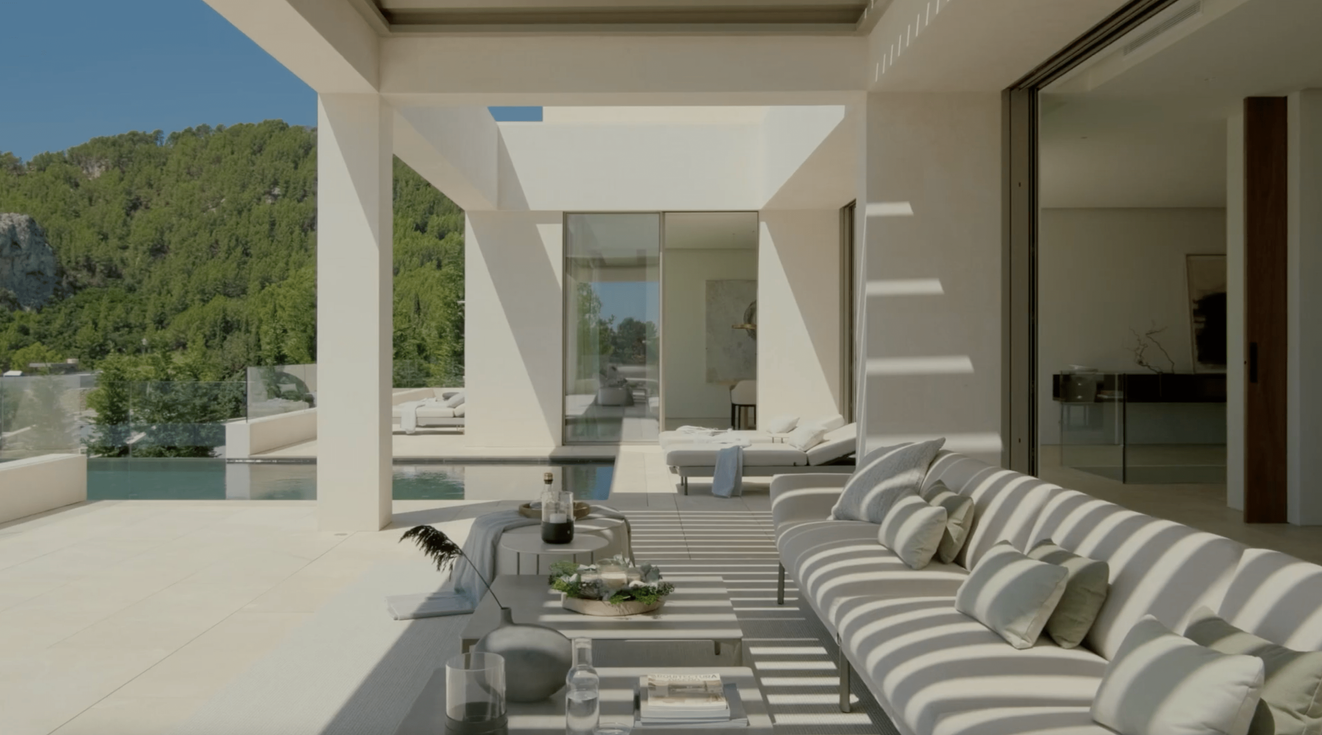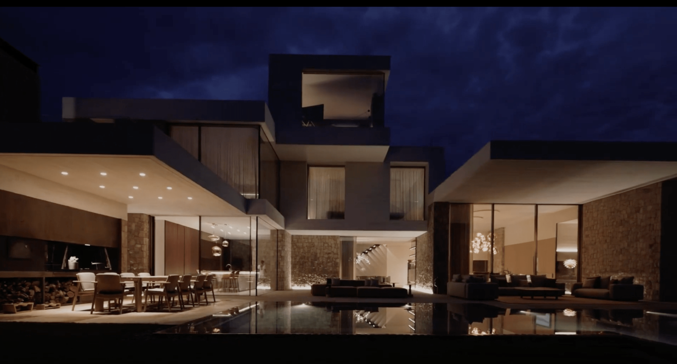 This project highlights luxurious outdoor spaces, including swimming pools, patios, and outdoor seating areas. The images showcase modern house exteriors, pool areas, and scenic mountain and ocean views.